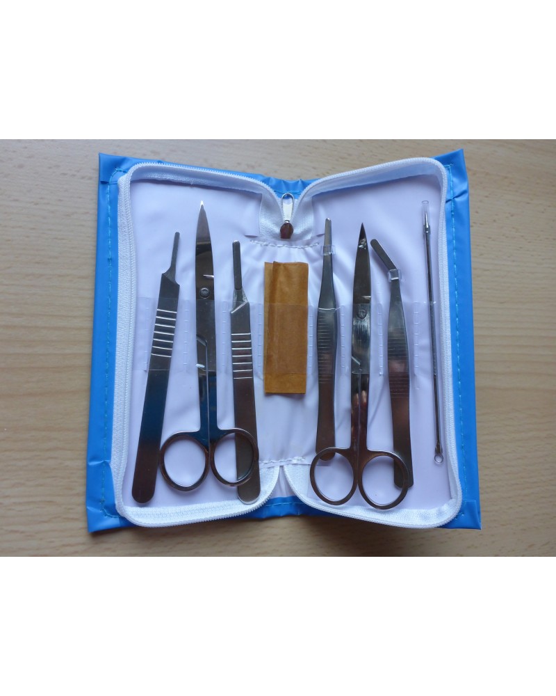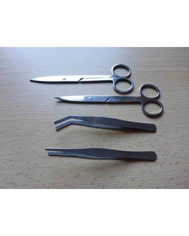 Sezierbesteck-Set bestehend aus 2 Scheren (1x flach, 1x gebogen), 2 unterschiedliche Pinzetten, 2 Skalpellgriffe inkl. 2 Klingen sowie einer dickeren Präpariernadel.