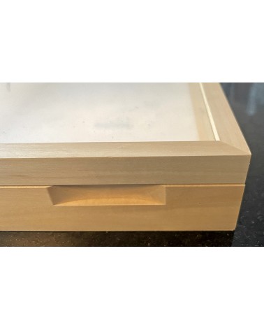-> Material: Ahorn, lasierend lackiert, Deckel mit eingelegtem 2mm Floatglas; 10 mm starke Steckeinlage aus Plastazote